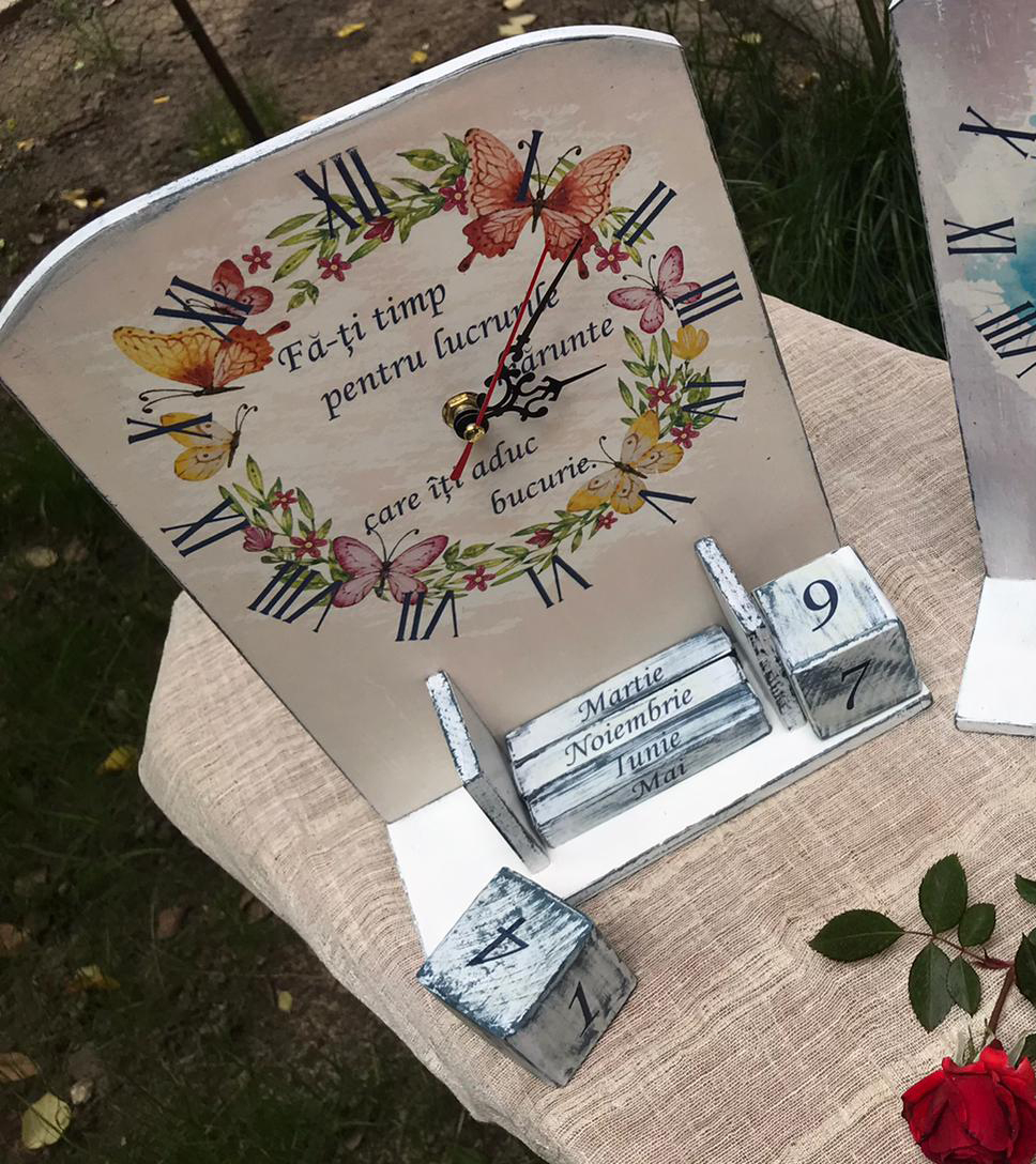 Calendar perpetuu cu ceas, handmade, model Fluturi și flori