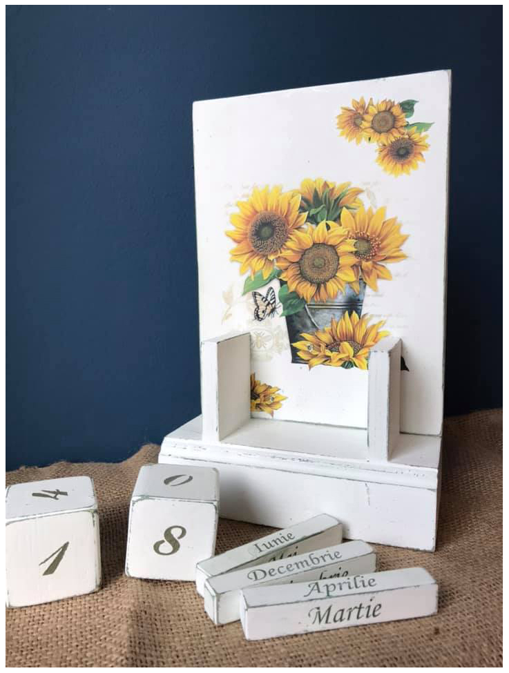 Calendarul este un obiect decorativ potrivit pentru birou sau living. Este realizat manual din lemn și mdf. Imaginea este imprimată prin tehnica transferului de imagine. Vopselurile sunt pe bază de apă. Calendarul este sigilat cu ceară. Ziua și luna se schimbă manual cu ajutorul pieselor din lemn. Datorită sigilării cu ceară, calendarul este plăcut atingerii, ușor catifelat. Fiind un obiect handmade, pot apărea mici diferențe între imaginile prezentate și produs.