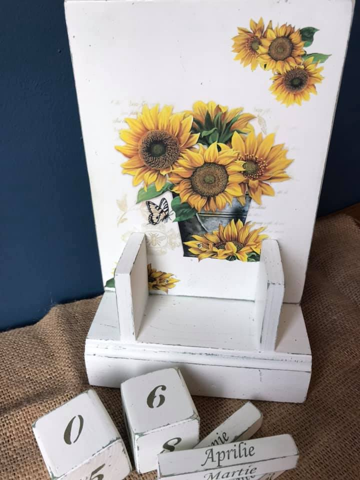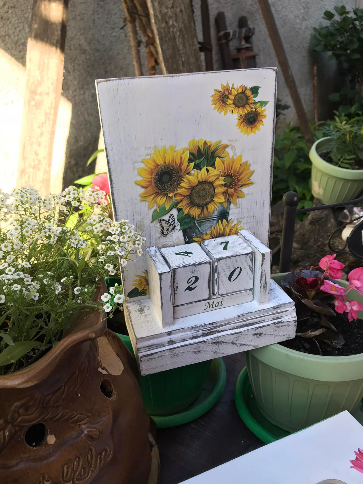 Calendar perpetuu handmade, realizat din lemn și mdf, model Floarea-soarelui, multicolor, aspect vintage
