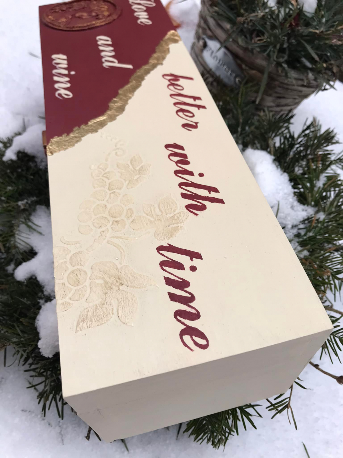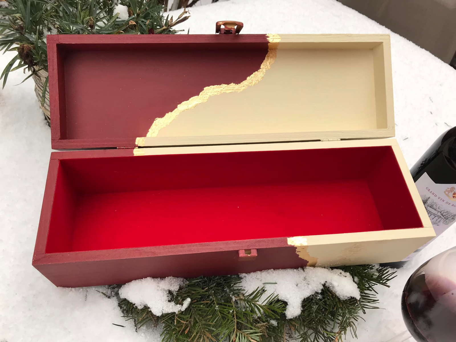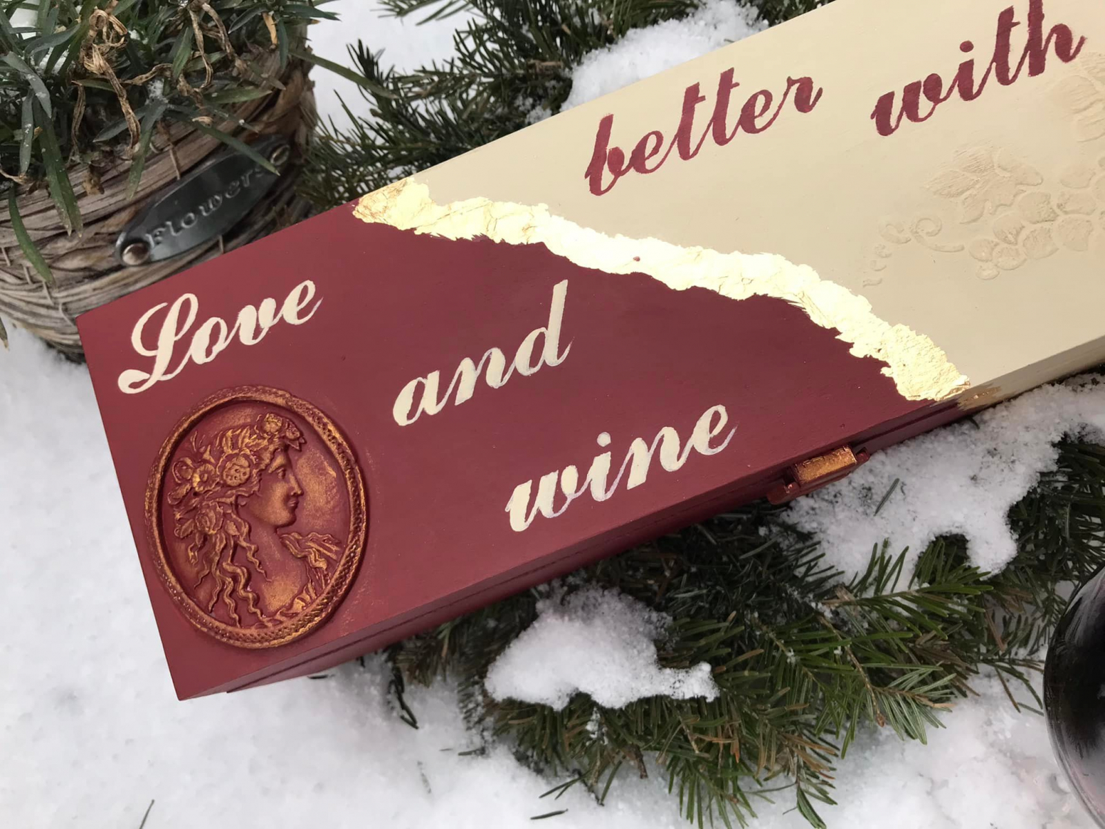 Cutia este un obiect decorativ cu rol de depozitare a sticlei de vin. Este realizată manual din mdf. Cutia este decorată cu modele 3D și foiță aurie. Interiorul cutiei este căptușit cu catifea. Vopselurile sunt pe bază de apă. Datorită finisării cu ceară, cutia este plăcută atingerii, ușor catifelată. Fiind un obiect handmade, pot apărea mici diferențe între imaginile prezentate și produs.