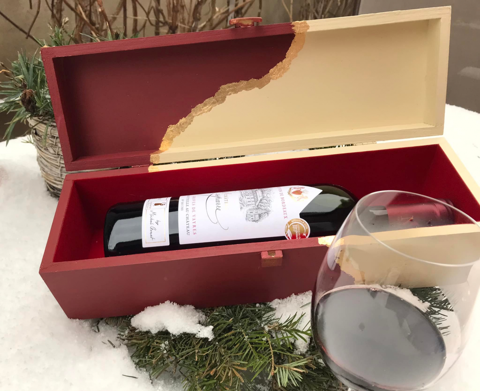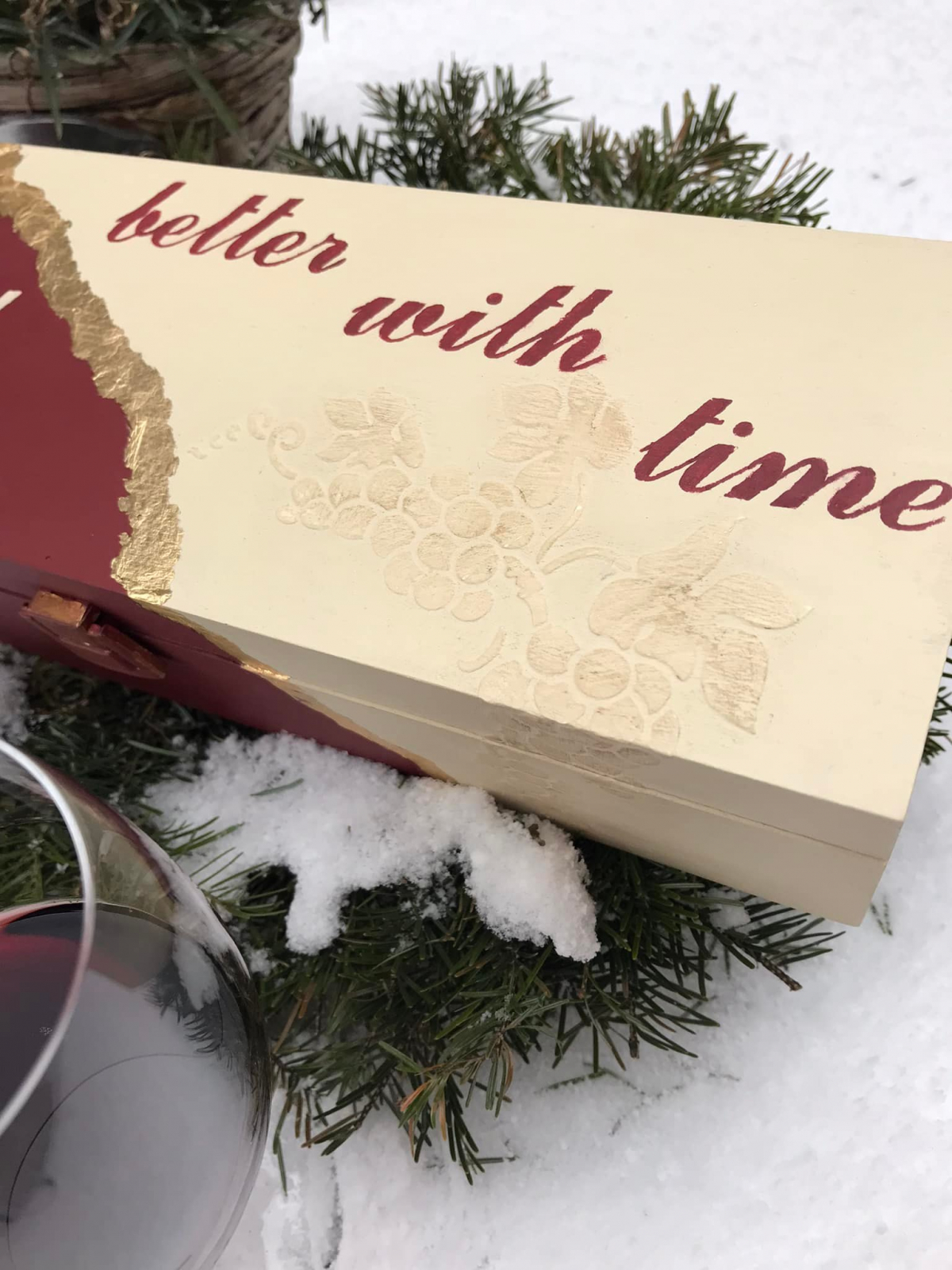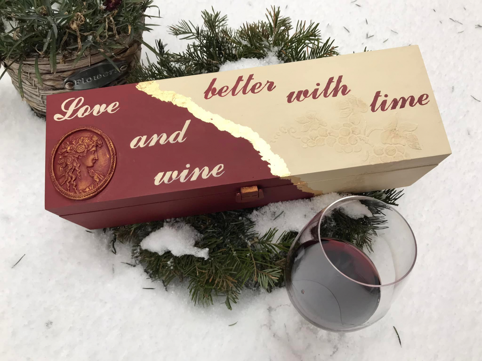 Cutia este un obiect decorativ cu rol de depozitare a sticlei de vin. Este realizată manual din mdf. Cutia este decorată cu modele 3D și foiță aurie. Interiorul cutiei este căptușit cu catifea. Vopselurile sunt pe bază de apă. Datorită finisării cu ceară, cutia este plăcută atingerii, ușor catifelată. Fiind un obiect handmade, pot apărea mici diferențe între imaginile prezentate și produs.