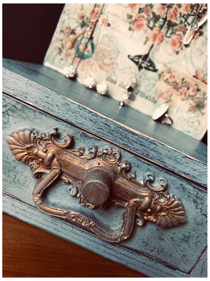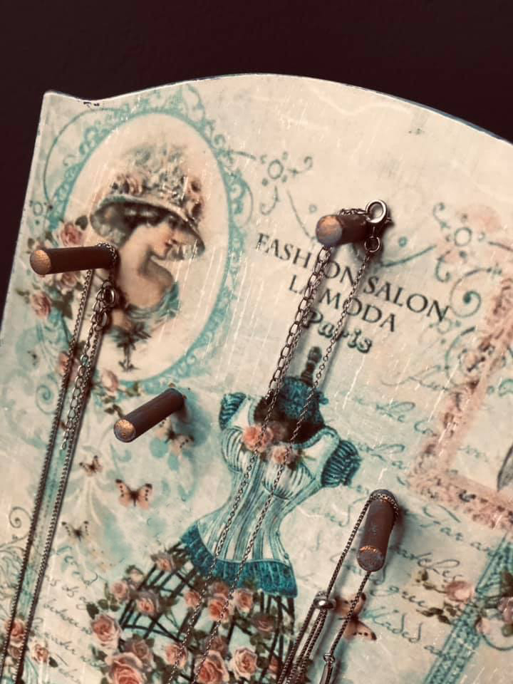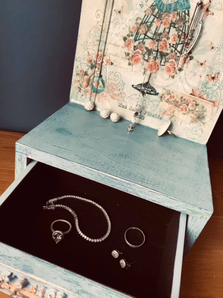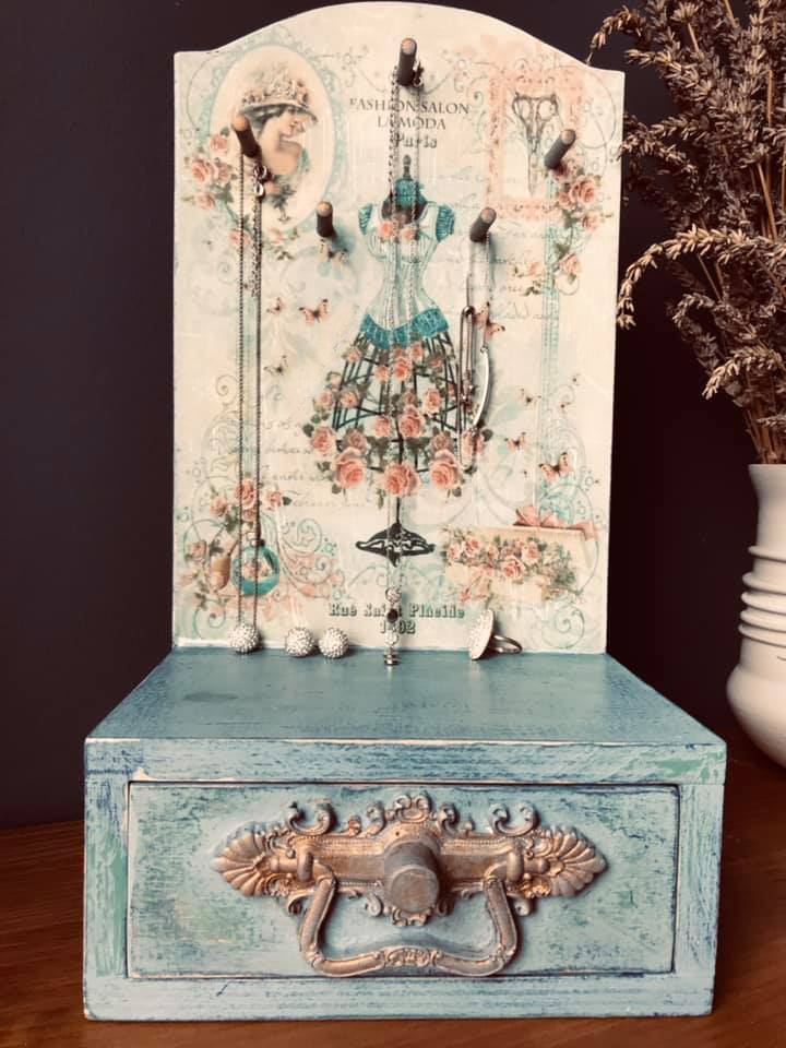 Suportul pentru bijuterii este realizat manual din mdf și este prevăzut cu agățătoare și sertar. Sertarul este căptușit cu catifea. Imaginea este realizată prin tehnica transferului de imagine. Vopselurile folosite sunt pe bază de apă, iar finisarea este cu ceară. Ceara aurie îi conferă un aer de eleganță. Aspectul este ușor antichizat. Datorită finisării cu ceară, suportul pentru bijuterii este plăcut atingerii, ușor catifelat. Fiind un obiect handmade, pot apărea mici diferențe între imaginile prezentate și produs.