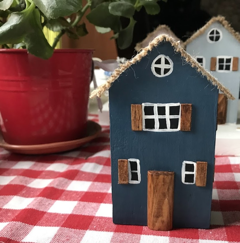 Decorațiuni din lemn model căsuțe. Pot fi vopsite în diverse culori, individuale sau prinse pe un suport. În funcție de finisaj, sunt decorațiuni de efect care se încadrează în aproape orice stil de design interior. Sunt mici bijuterii realizate cu multă migală, cu obloane și uși aplicate și ceruite individual. Materialele folosite la finisaje sunt pe bază de apă.