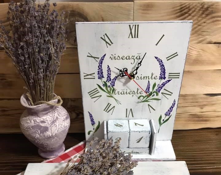 Decorațiuni cu ceas realizate manual. Sunt pictate manual cu acrilice sau prin tehnica transferului de imagine. Vopselurile sunt pe bază de apă. Finisajul are un aspect antichizat.