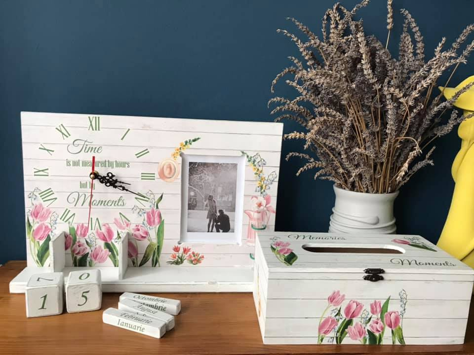 Decorațiuni cu ceas realizate manual. Sunt pictate manual cu acrilice sau prin tehnica transferului de imagine. Vopselurile sunt pe bază de apă. Finisajul are un aspect antichizat.