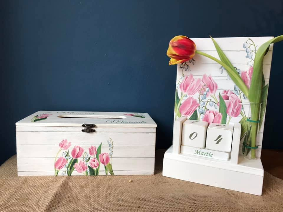 Setul este format din calendar perpetuu cu eprubetă și suport pentru șervețele. Este realizat manual din lemn și mdf. Imaginea este imprimată prin tehnica transferului de imagine. Vopselurile sunt pe bază de apă iar finisarea este cu ceară. Ziua și luna se schimbă manual cu ajutorul pieselor din lemn. Eprubeta are rol de "mini vază". Capacul este prevăzut cu balamale și închizătoare. Datorită sigilării cu ceară, setul este plăcut atingerii, ușor catifelat. Fiind realizat manual, pot apărea mici diferențe între imaginile prezentate și produs.