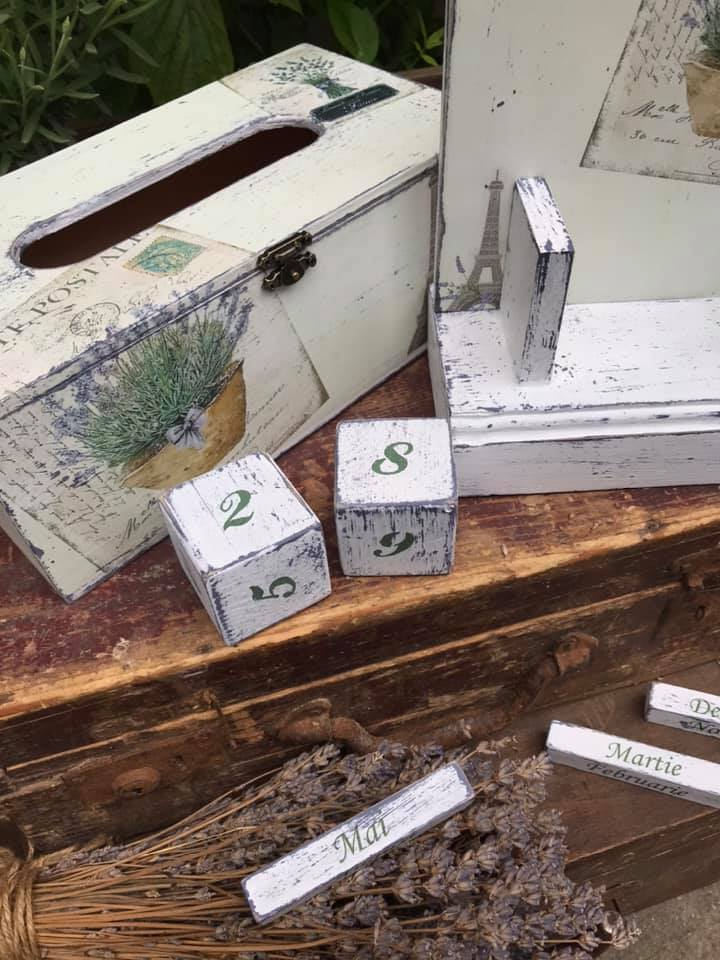 Setul este format din calendar perpetuu și suport pentru șervețele. Este realizat manual din lemn și mdf. Imaginea este imprimată prin tehnica transferului de imagine. Vopselurile sunt pe bază de apă iar finisarea este cu ceară. Ziua și luna se schimbă manual cu ajutorul pieselor din lemn. Capacul este prevăzut cu balamale și închizătoare. Datorită sigilării cu ceară, setul este plăcut atingerii, ușor catifelat. Fiind realizat manual, pot apărea mici diferențe între imaginile prezentate și produs.