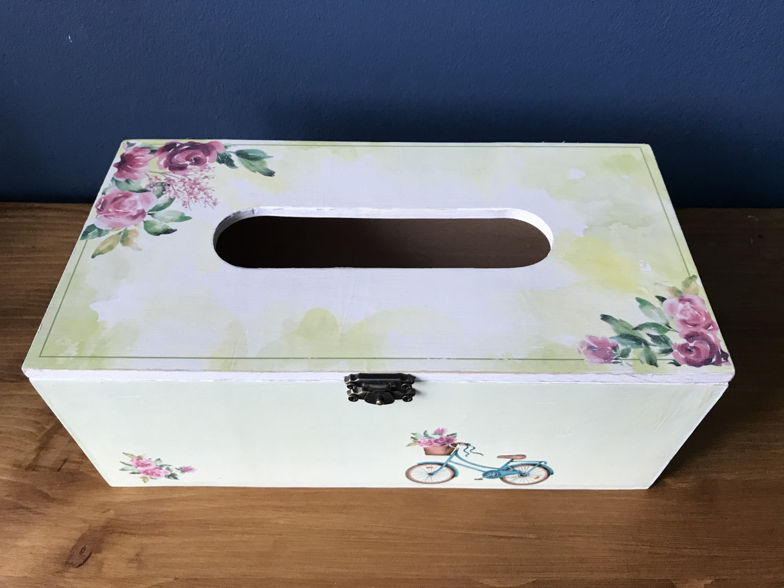 Suport din mdf pentru șervețele, realizat manual. Produsul este vopsit manual cu vopsea cretată pe bază de apă. Imaginile sunt realizate prin tehnica transferului, iar suprafața este finisată cu ceară. Capacul este prevăzut cu balamale și închizătoare. Datorită sigilării cu ceară, cutia are un aspect plăcut catifelat. Produsul fiind handmade, pot apărea mici diferențe între imaginile prezentate și produs.
