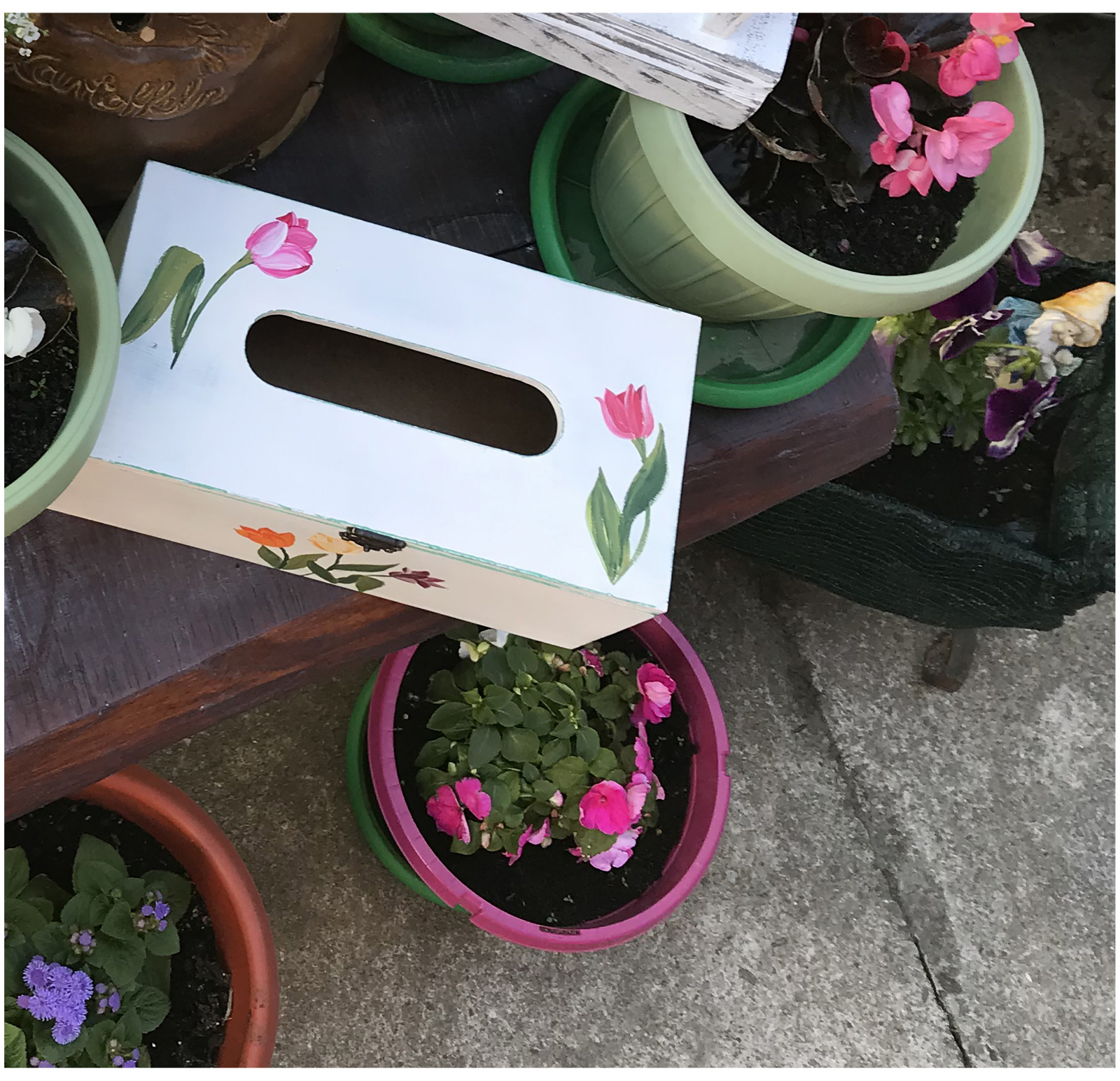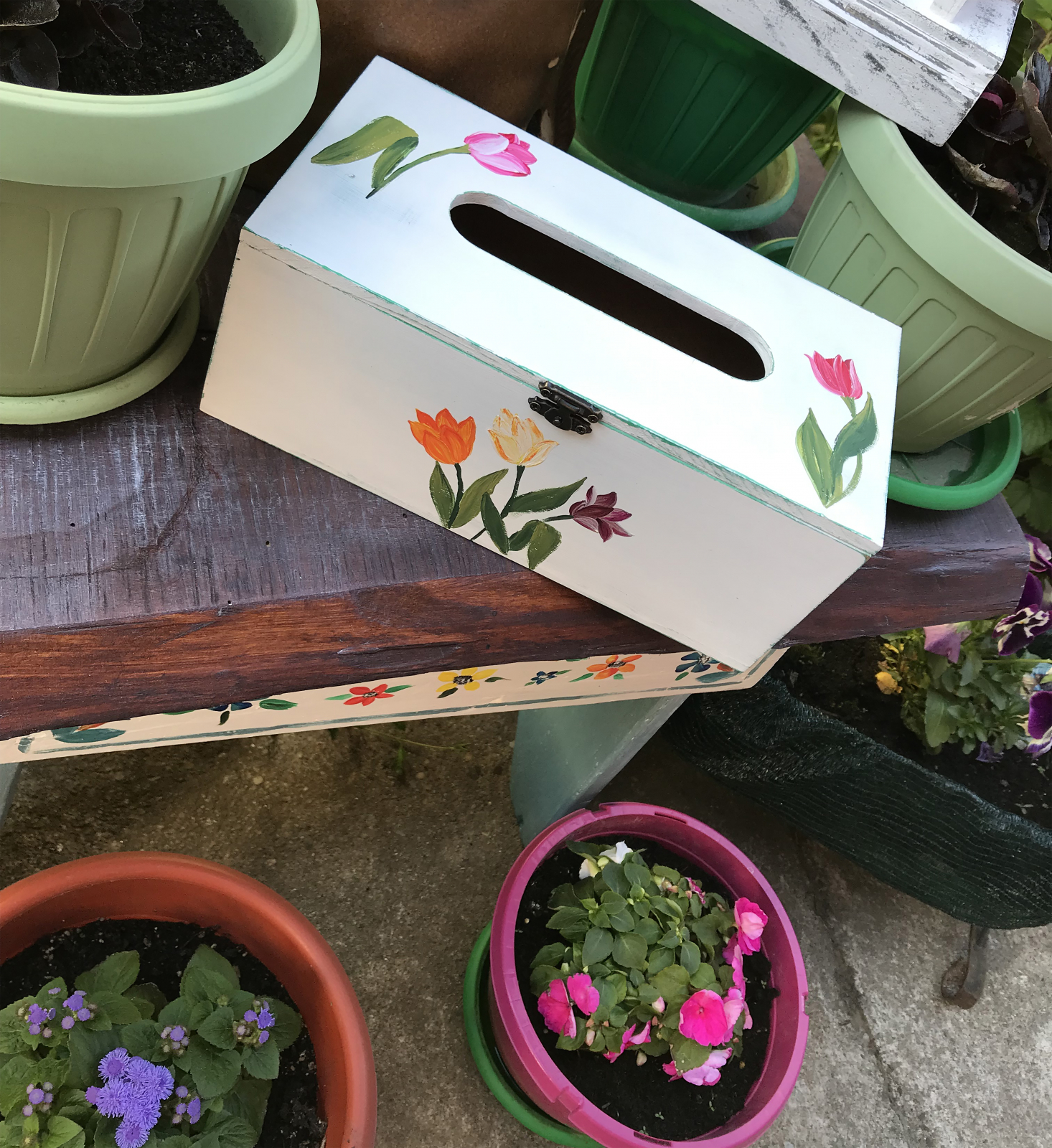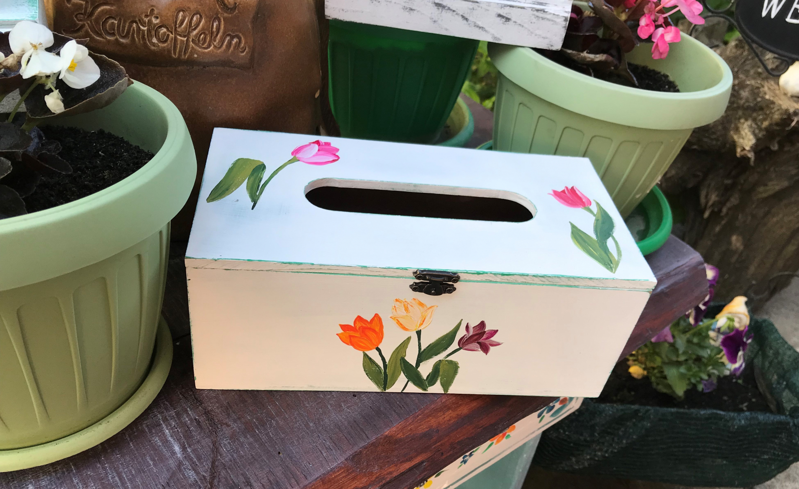 Suport din mdf pentru șervețele, pictat manual cu acrilice. Vopselurile sunt pe bază de apă. Datorită finisării cu ceară, cutia are un aspect plăcut catifelat. Capacul este prevăzut cu balamale și închizătoare. Fiind pictată manual, pot apărea mici diferențe între imaginile prezentate și produs, deoarece este destul de dificil ca două obiecte să fie realizate identic.