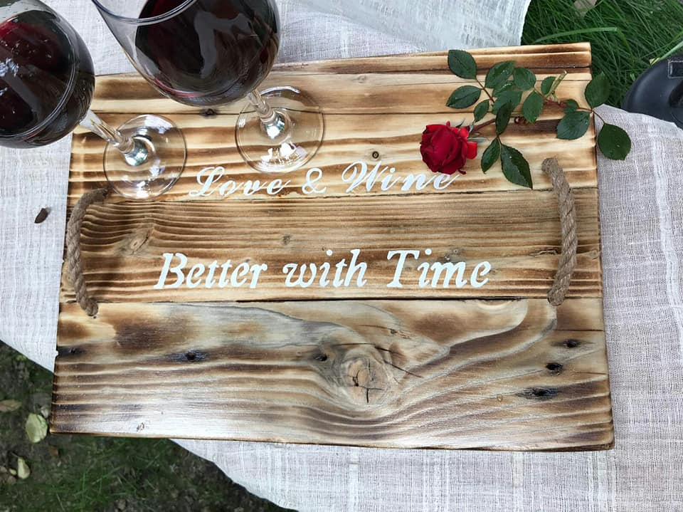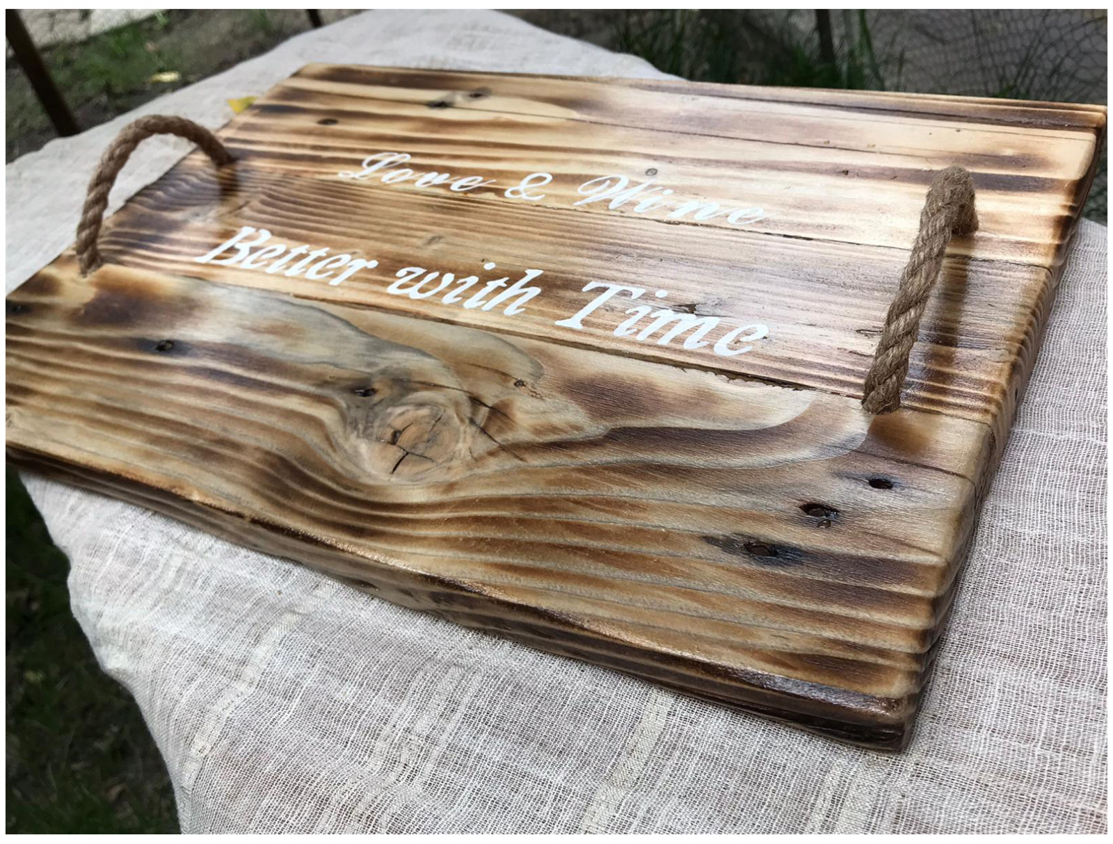 Tava este realizată din lemn antichizat. Mânerele sunt din sfoară groasă. Mesajul pictat și finisarea sunt realizate cu produse pe bază de apă. Produsul fiind handmade, pot apărea mici diferențe între imaginile prezentate și produs.