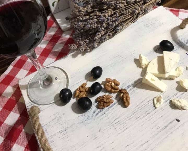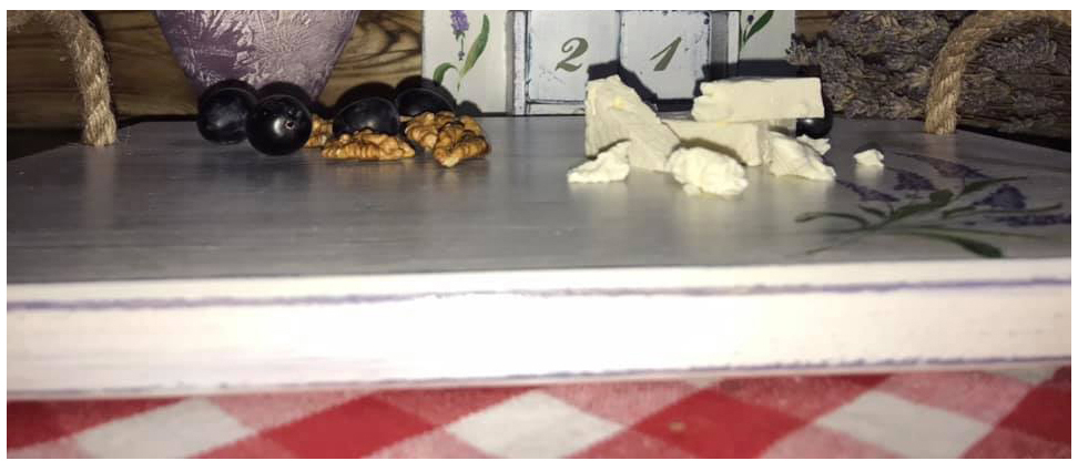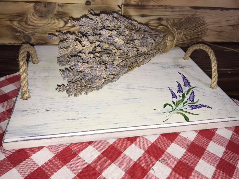 Tava este realizată din lemn. Mânerele sunt din sfoară groasă. Florile sunt pictate cu acrilice, vopselurile sunt pe bază de apă, iar finisarea este realizată cu lac pe bază de apă. Produsul fiind handmade, pot apărea mici diferențe între imaginile prezentate și produs.