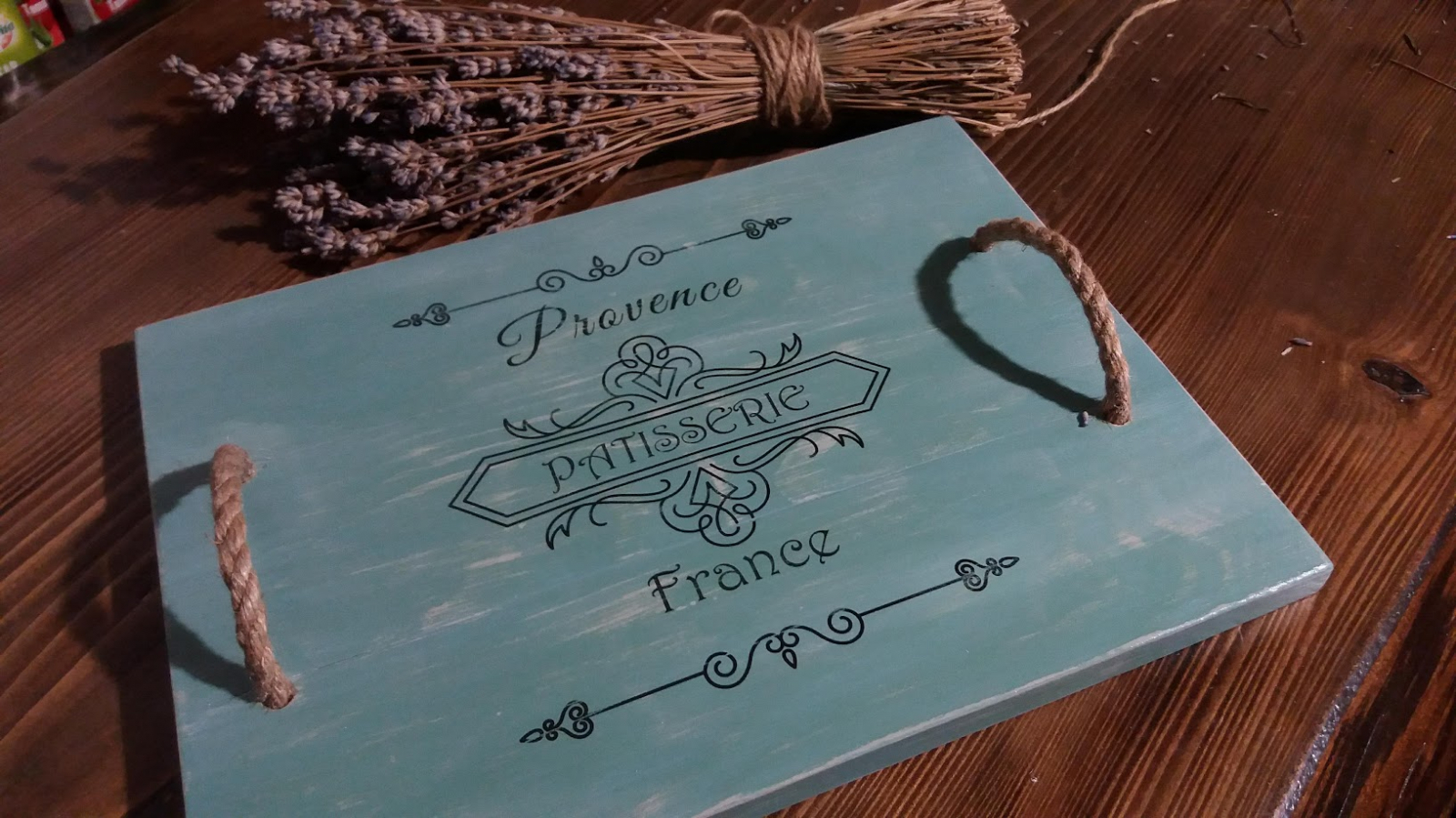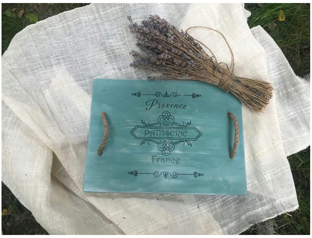 Tavă din lemn cu mânere din sfoară groasă, realizată manual. Produsele folosite sunt pe bază de apă. Imaginea este realizată prin tehnica transferului de imagine.