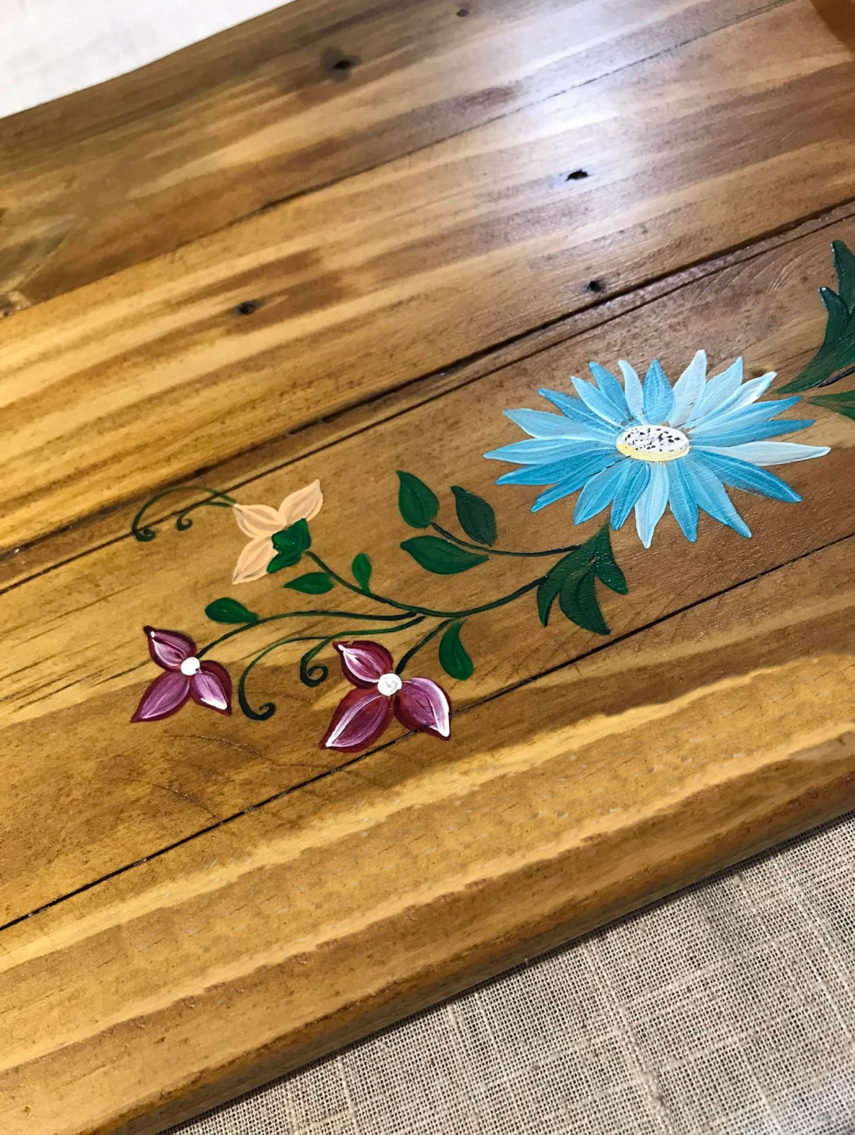 Tava este realizată din lemn antichizat. Mânerele sunt din sfoară groasă. Florile sunt pictate cu acrilice iar finisarea este realizată cu lac pe bază de apă. Produsul fiind handmade, pot apărea mici diferențe între imaginile prezentate și produs.