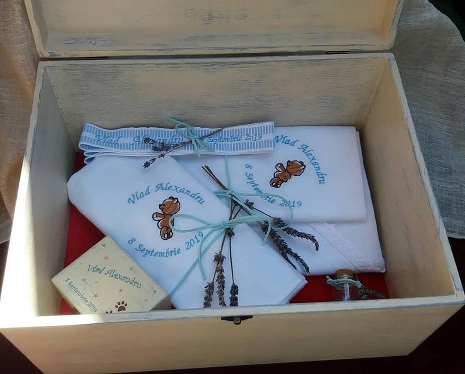 Trusouri botez personalizate cu numele bebelușului și data botezului. Toate detaliile privind grafica dorită și datele cu care urmează să fie personalizat trusoul, sunt stabilite apelând telefonul din contact. Menționăm că, în funcție de tema botezului, se pot realiza și alte modele de trusouri pe lângă cele prezentate deja pe site.