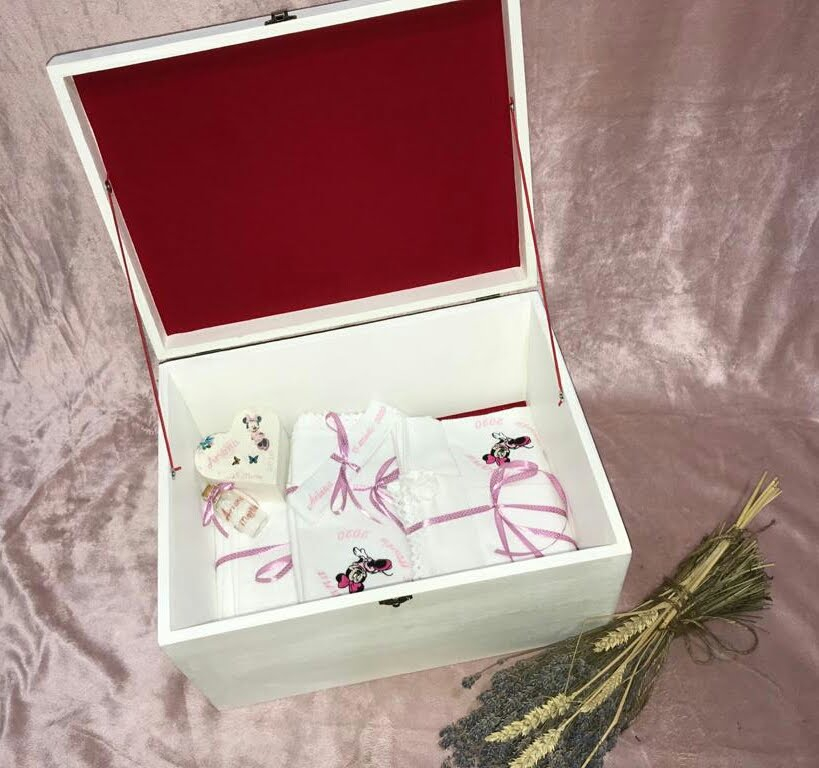 Trusoul de botez este personalizat cu numele bebelușului și data botezului. Conține cufăr din lemn, cutiuță, sticluță pentru mir, pânză mir din finet, prosopel din finet, fașă, prosop pentru preot. Fundul cufărului și al cutiuței sunt căptușite cu material. Dimensiunile cufărului sunt generoase, 40x30x22 cm, astfel încât trusoul încape cu ușurință, lăsând loc și altor cadouri din partea nașilor. Cufărul este prevăzut cu mânere. Pânza de mir, prosopelul și fașa sunt brodate cu numele bebelușului și data botezului, iar sticluța de mir este pictată. Vopselurile și lacul sunt pe bază de apă. Aspectul cufărului și al cutiuței este ușor antichizat.