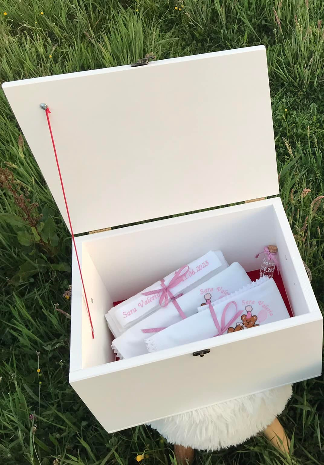 Trusoul de botez este personalizat cu numele bebelușului și data botezului. Conține cufăr din lemn, cutiuță, sticluță pentru mir, pânză mir din finet, prosopel din finet, fașă, prosop pentru preot. Fundul cufărului și al cutiuței sunt tapetate cu catifea. Dimensiunile cufărului sunt generoase, 40x30x22 cm, astfel încât trusoul încape cu ușurință, lăsând loc și altor cadouri din partea nașilor. Cufărul este prevăzut cu mânere. Pânza de mir, prosopelul și fașa sunt brodate cu numele bebelușului și data botezului, iar sticluța de mir este pictată. Vopselurile și lacul sunt pe bază de apă. Aspectul cufărului și al cutiuței este ușor antichizat.