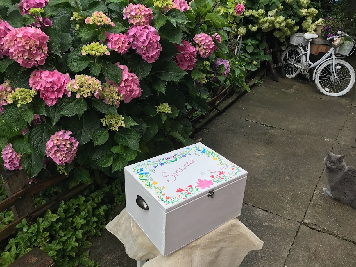 Trusoul de botez este personalizat cu numele bebelușului și data botezului. Conține cufăr din lemn pictat manual, cutiuță pictată manual, sticluță pentru mir, pânză mir din finet, prosopel din finet, fașă, prosop pentru preot. Fundul cufărului și al cutiuței sunt tapetate cu catifea. Dimensiunile cufărului sunt generoase, 40x30x22 cm, astfel încât trusoul încape cu ușurință, lăsând loc și altor cadouri din partea nașilor. Cufărul este prevăzut cu mânere. Pânza de mir, prosopelul și fașa sunt brodate cu numele bebelușului și data botezului, iar sticluța de mir este pictată. Pictura este realizată cu acrilice, iar vopselurile și lacul sunt pe bază de apă. Aspectul cufărului și al cutiuței este ușor antichizat.